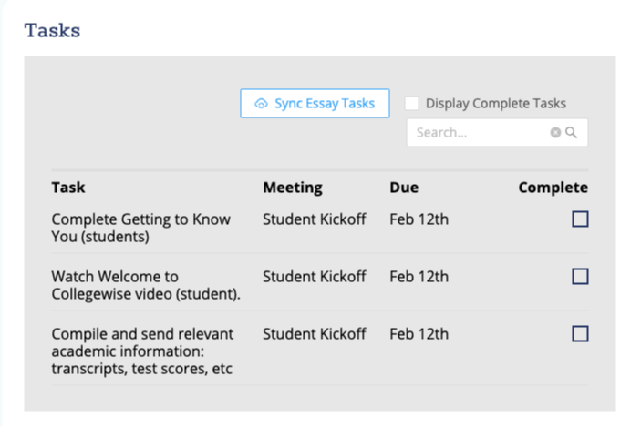 • Notes from your Collegewise counselor to recap meetings